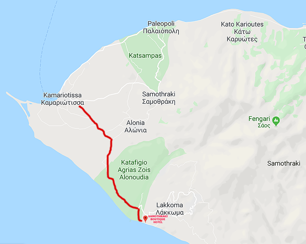 Εδώ θα βρείτε αναλυτικές οδηγίες για τη μετάβαση σας με αυτοκίνητο από το λιμάνι της Καμαριώτισσας προς το συγκρότημα “Samothraki Beach Boutique Hotel”, το οποίο βρίσκεται σε απόσταση 6 περίπου χιλιομέτρων από την πόλη και το λιμάνι (Καμαριώτισσα). Ο οδηγίες συνοδεύονται και από βοηθητικό βίντεο με σήμανση στον χάρτη.